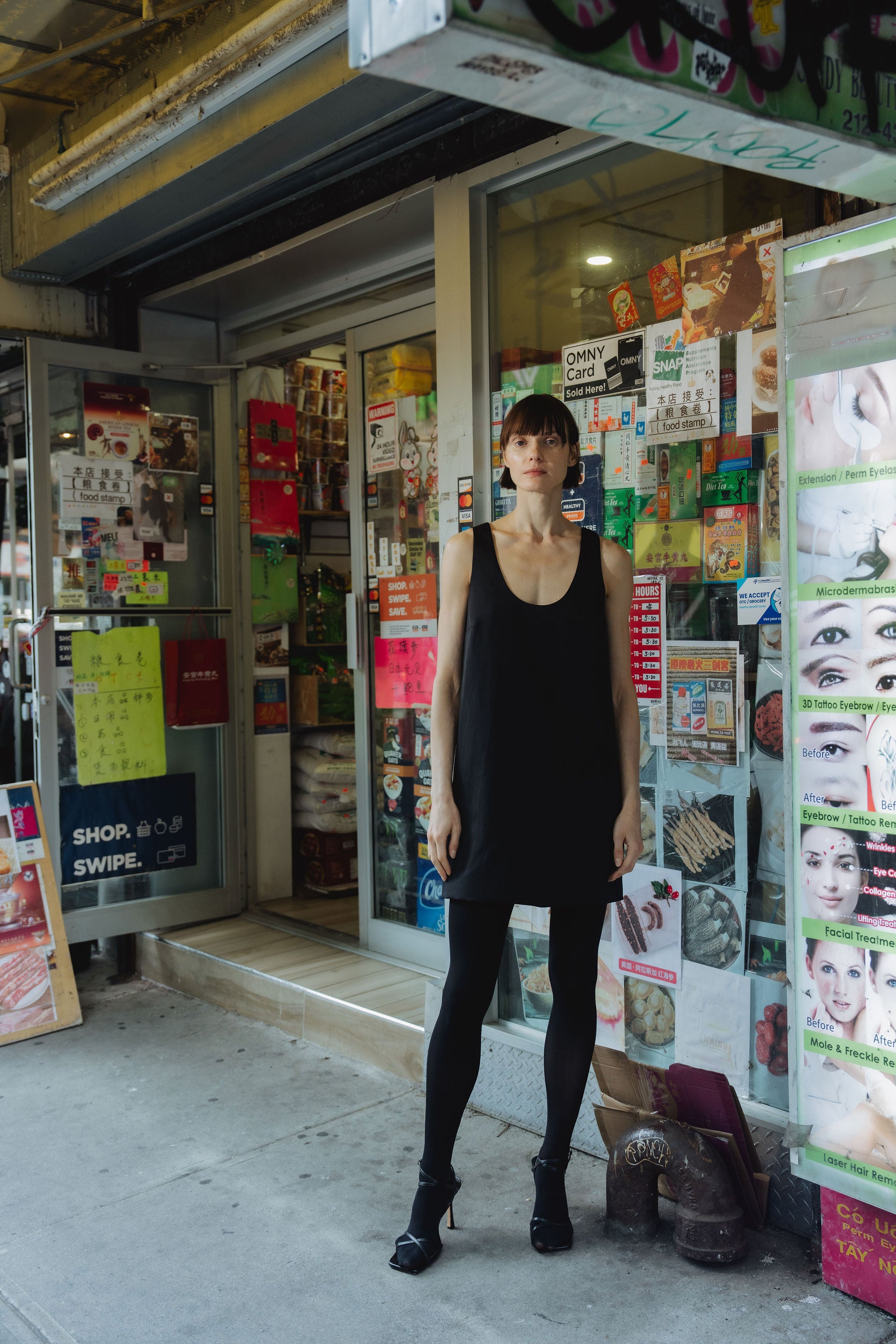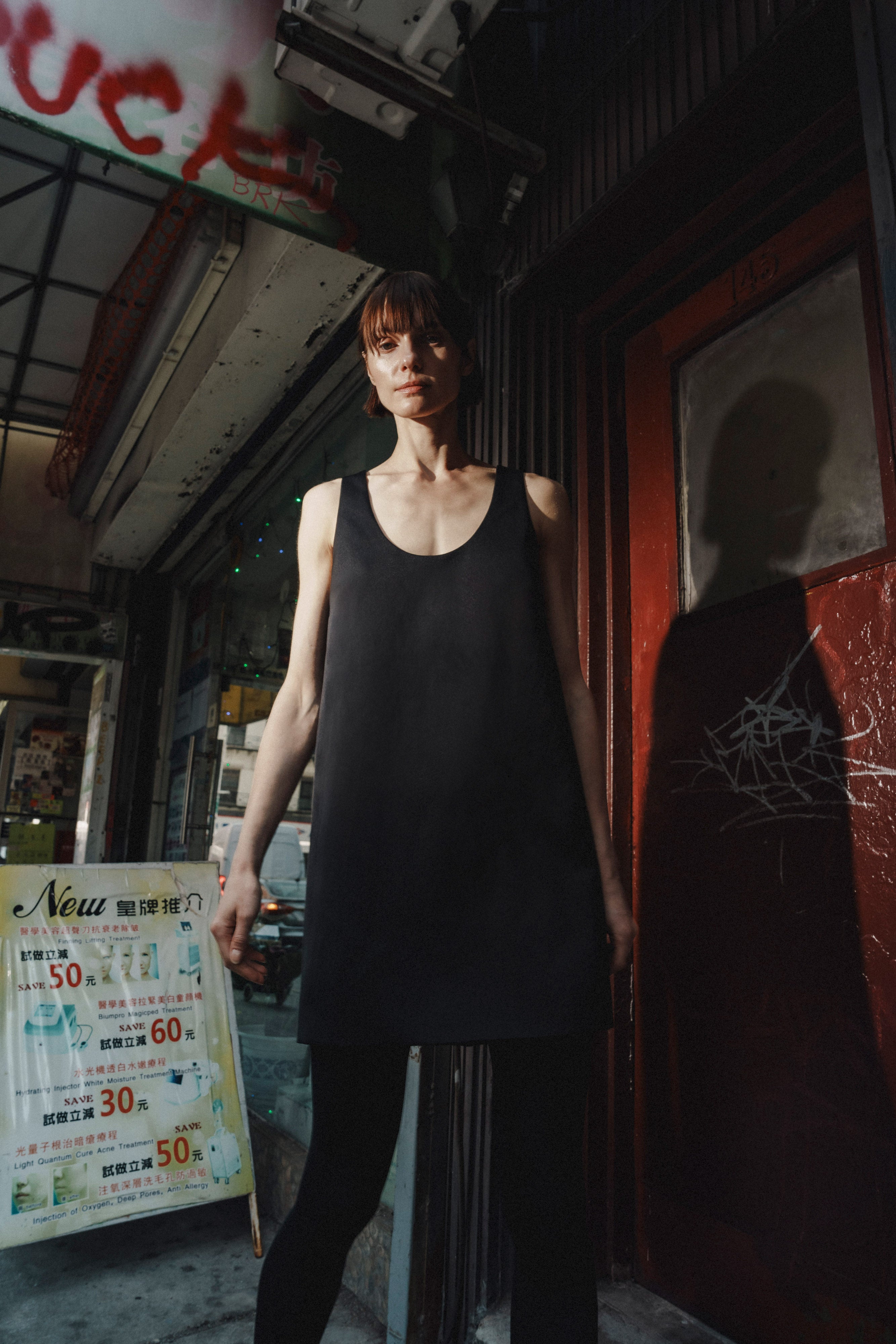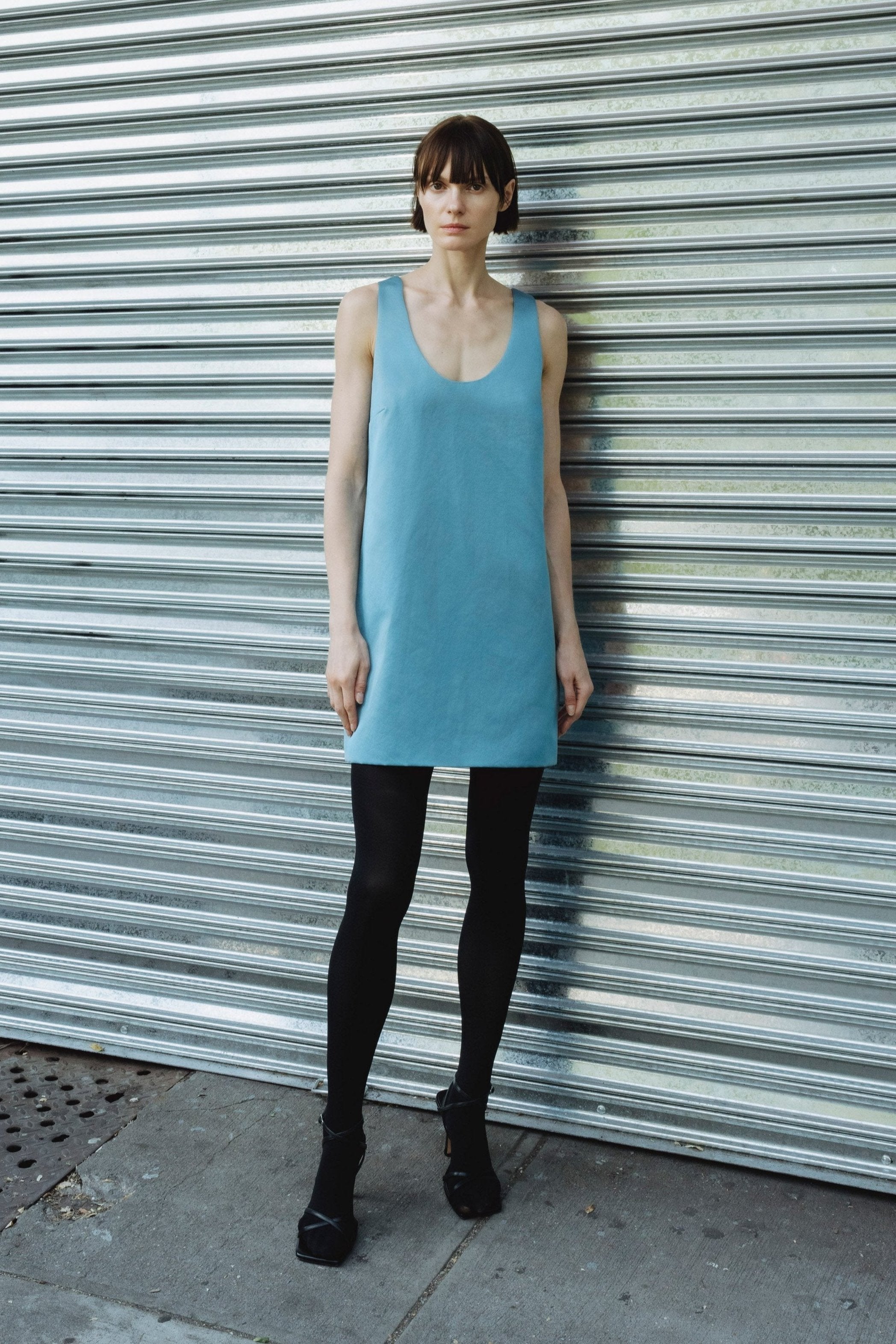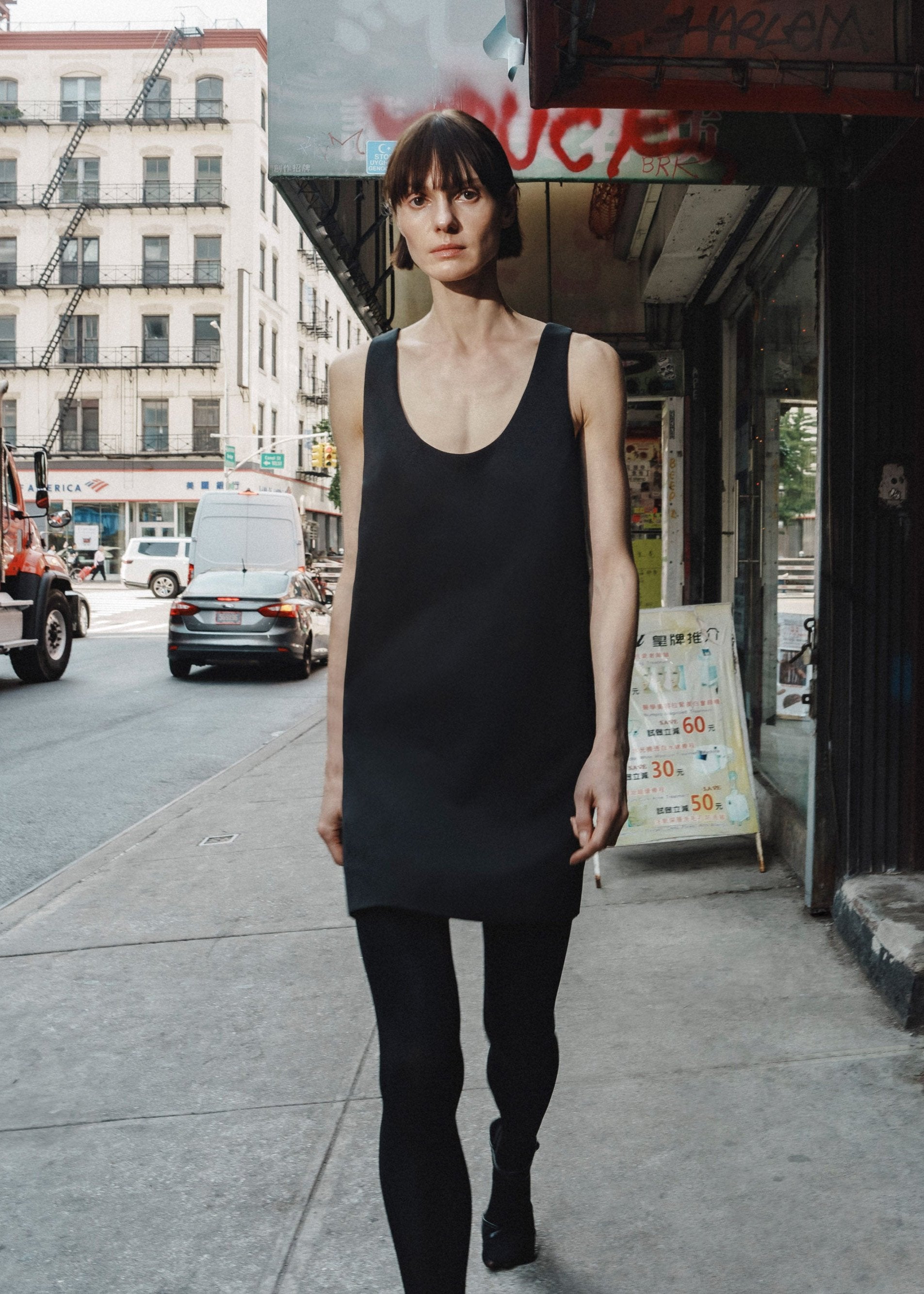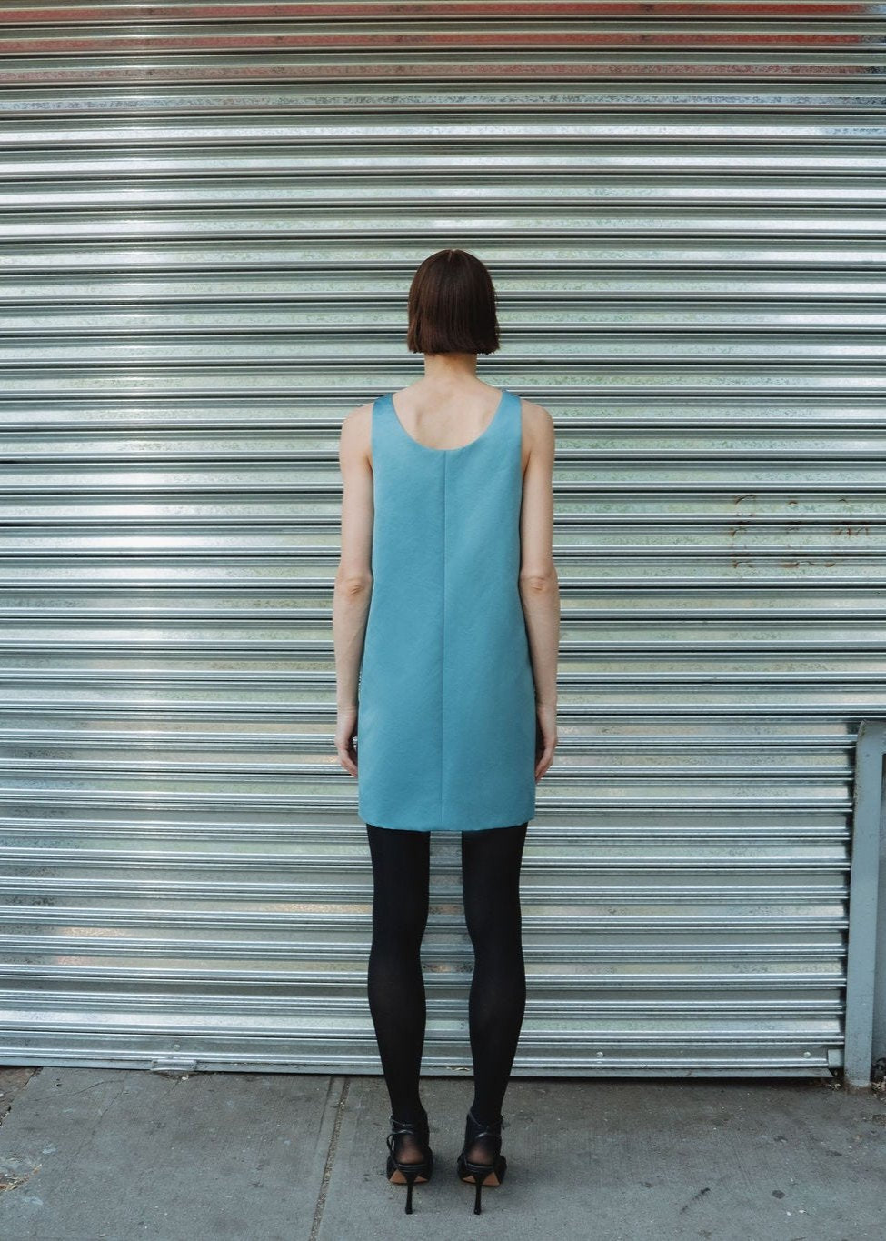 Crafted in sleek Italian duchesse satin, the Tabachin minidress is a playful take on the Tabachin long dress. It features a structured straight silhouette and a deep round decollete. Side zip closure.