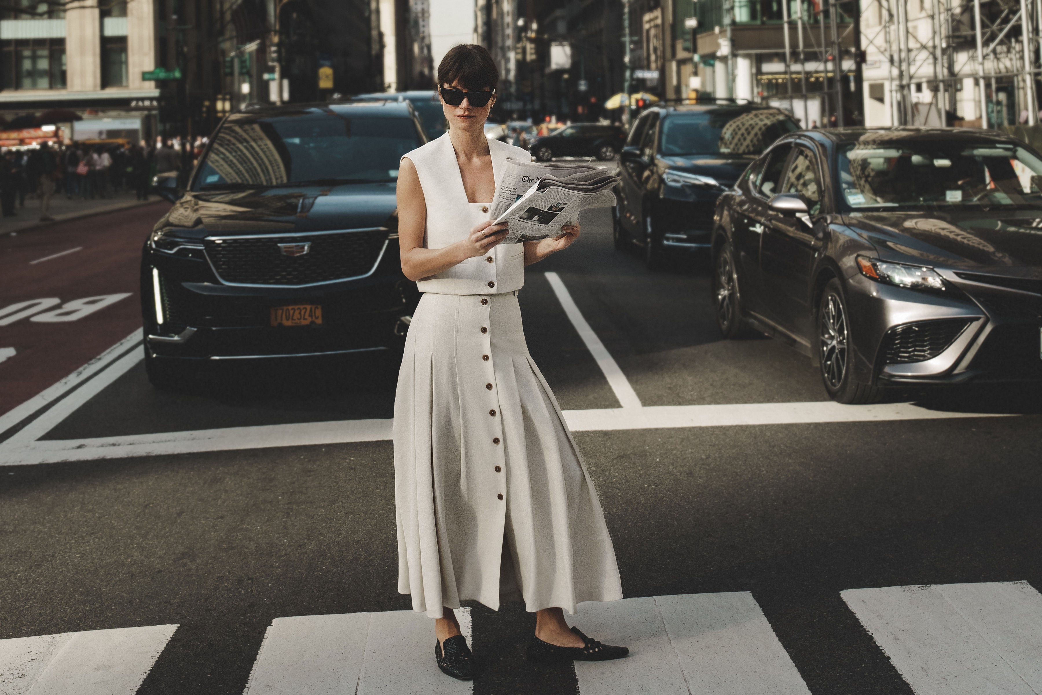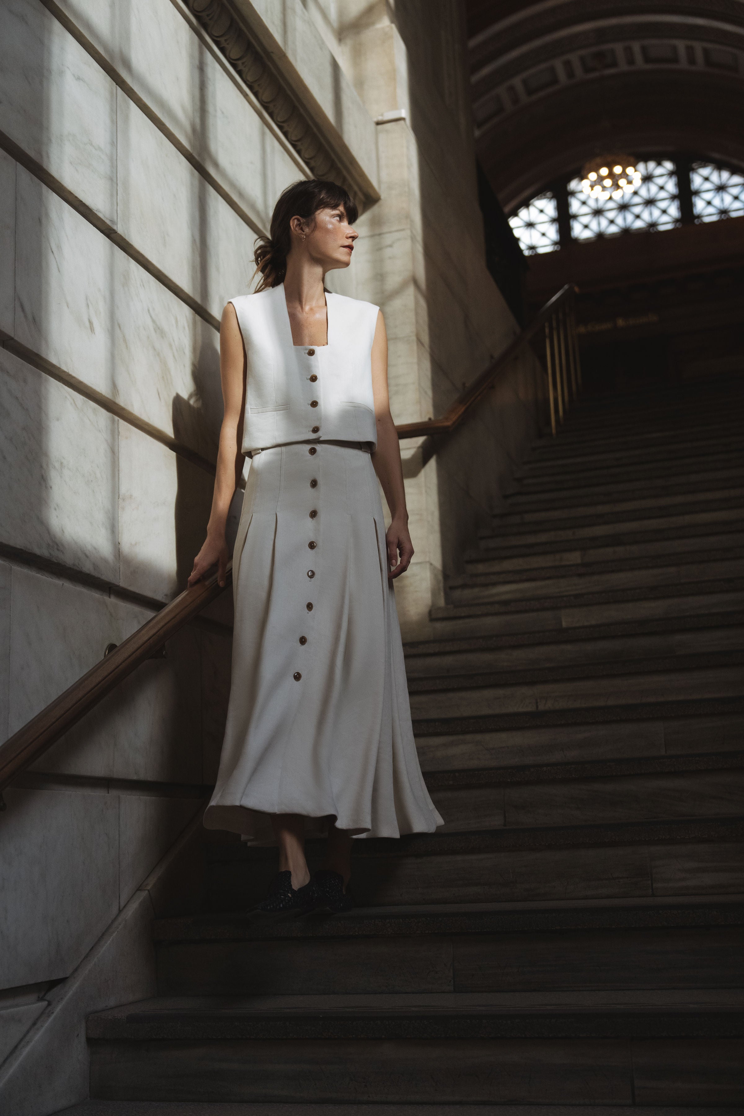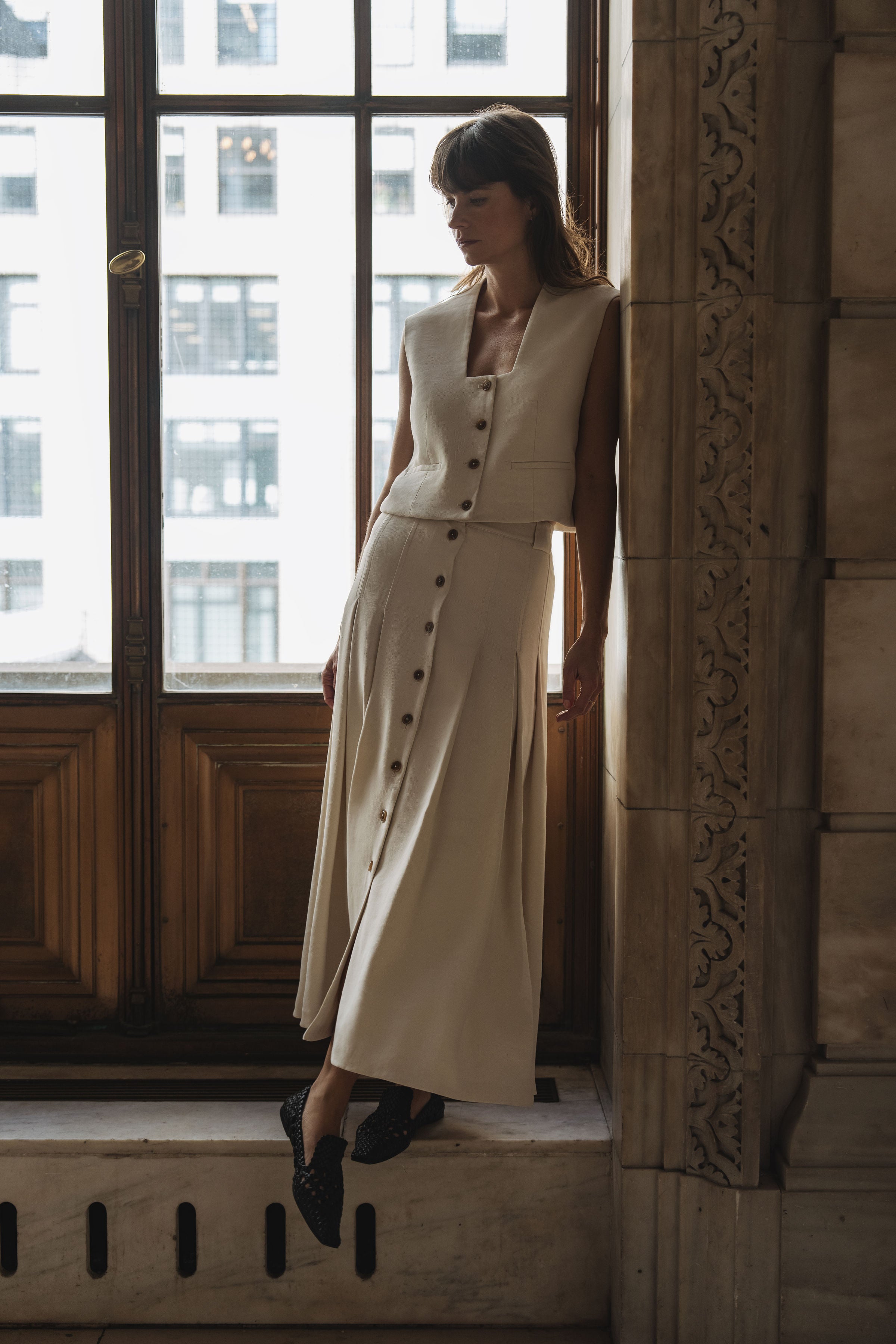The Ambrosia skirt is crafted from supple Italian linen twill. Top-stitched pleats on the front and back give beautiful movement to its streamlined shape. The Ambrosia skirt features horn style buttons down the front, a comfortable waistband and flattering ankle length. Lined in silk. Its versatility makes it a closet staple that can be worn year-round and can be styled with the coordinating Ambrosia top.