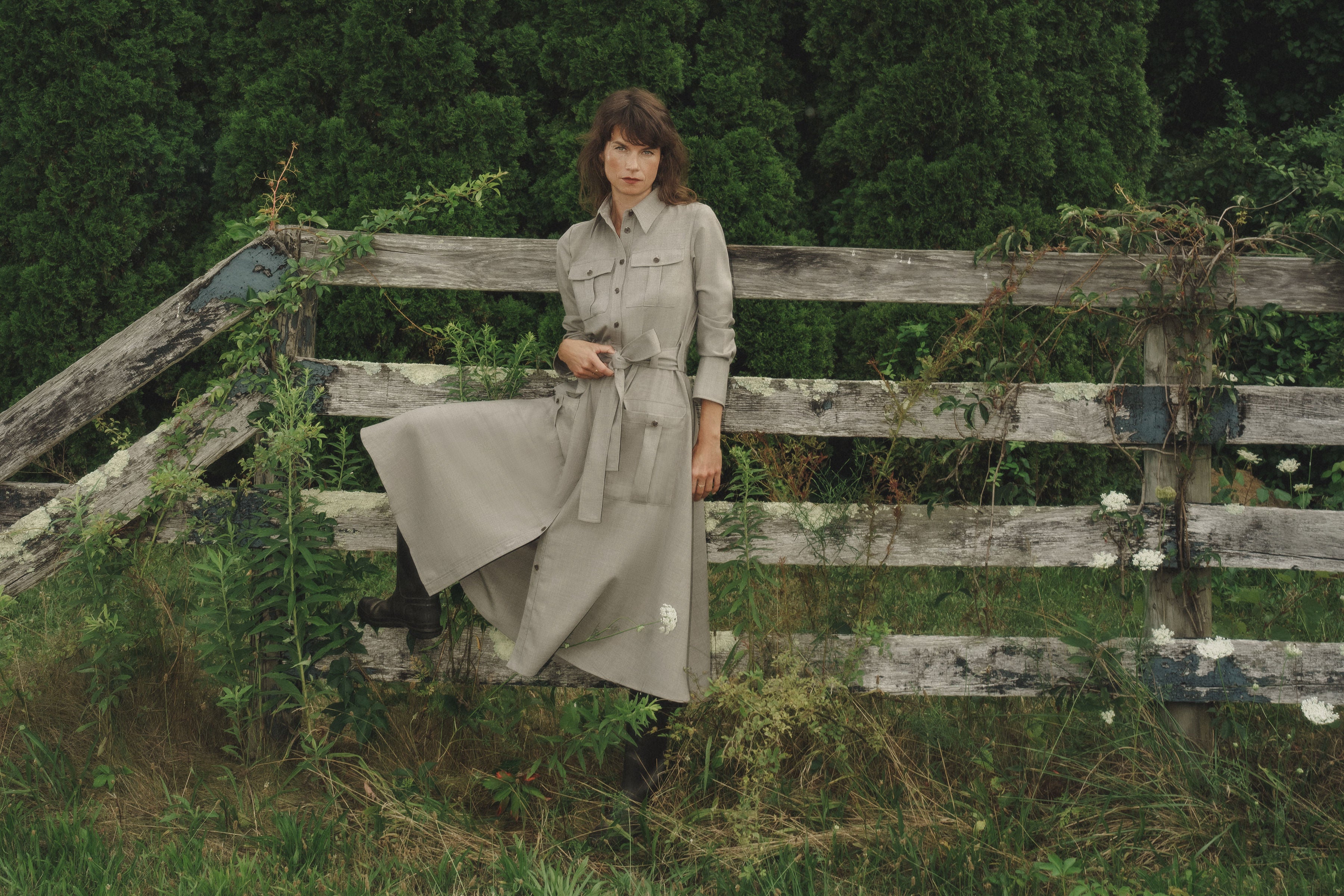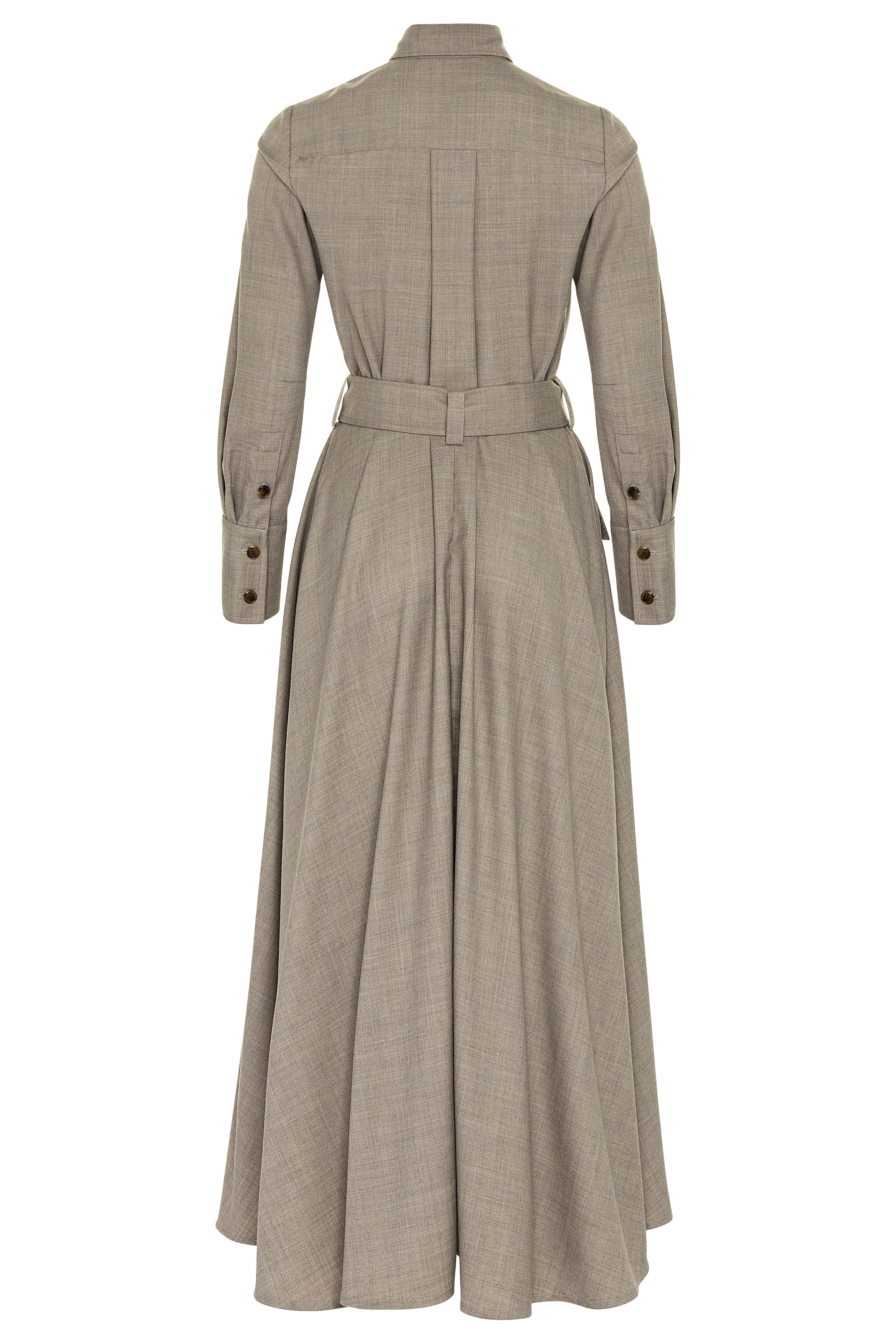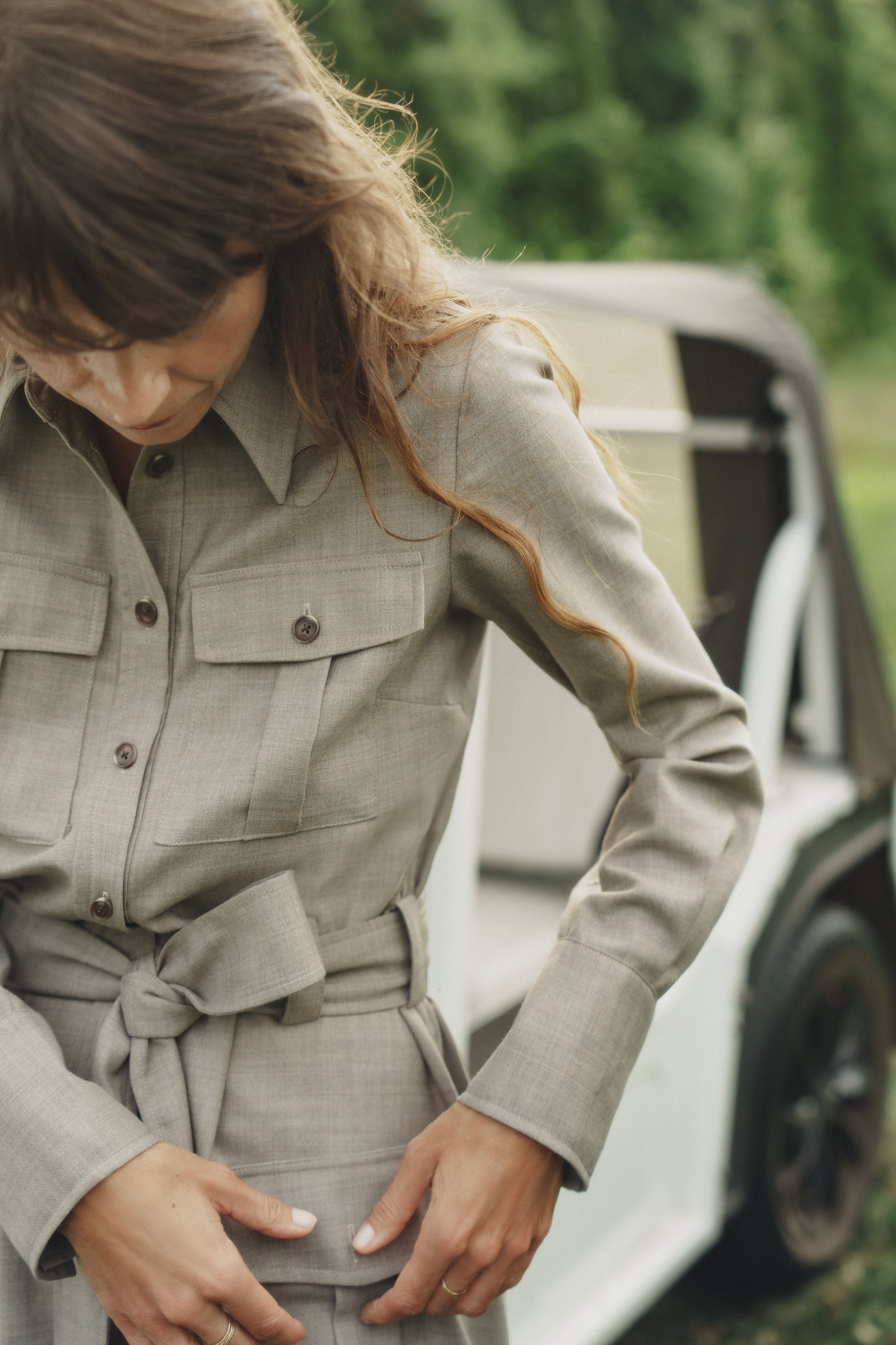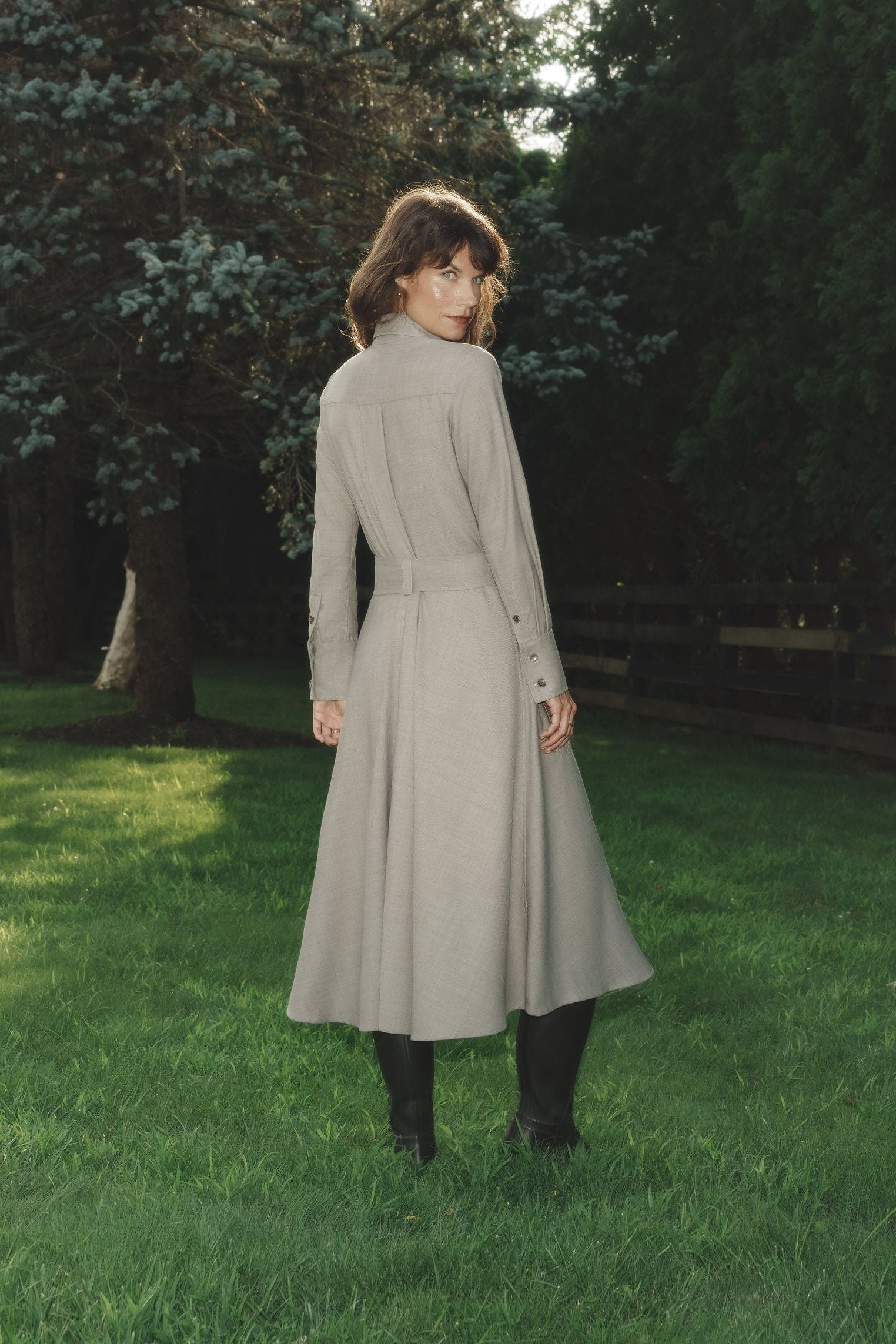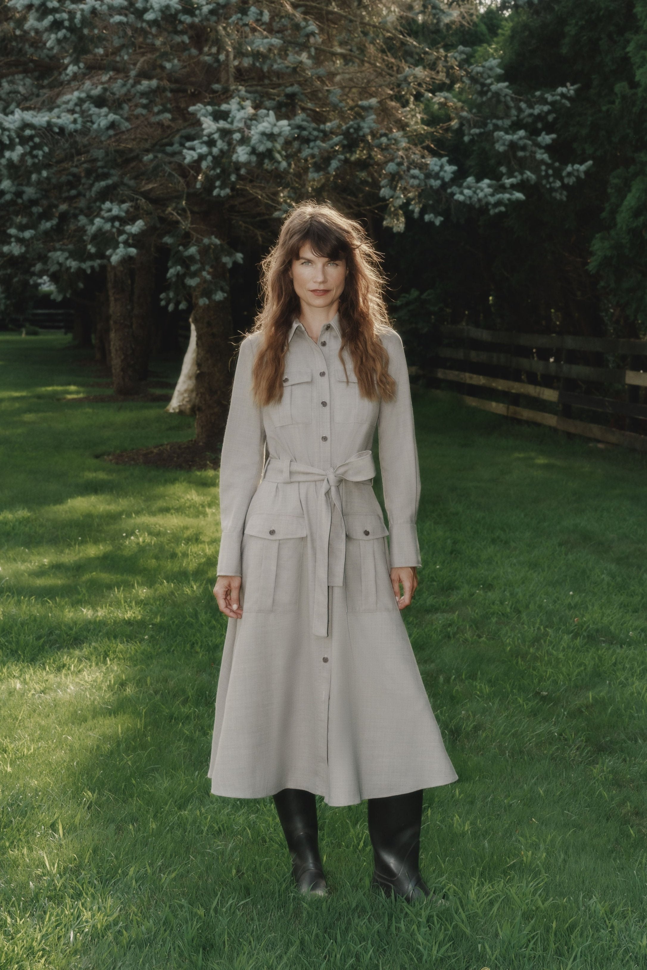 The Stathe Huascapul Dress has a button-front closure and ties at the waist with a belt creating an easy blouson fit. Structure and movement create contrast in this classic design that is accentuated by overized front pockets and oversized cuffs on the sleeves. It is made with a lightweight Japanese wool blend and is unlined. Fit is slightly oversized.