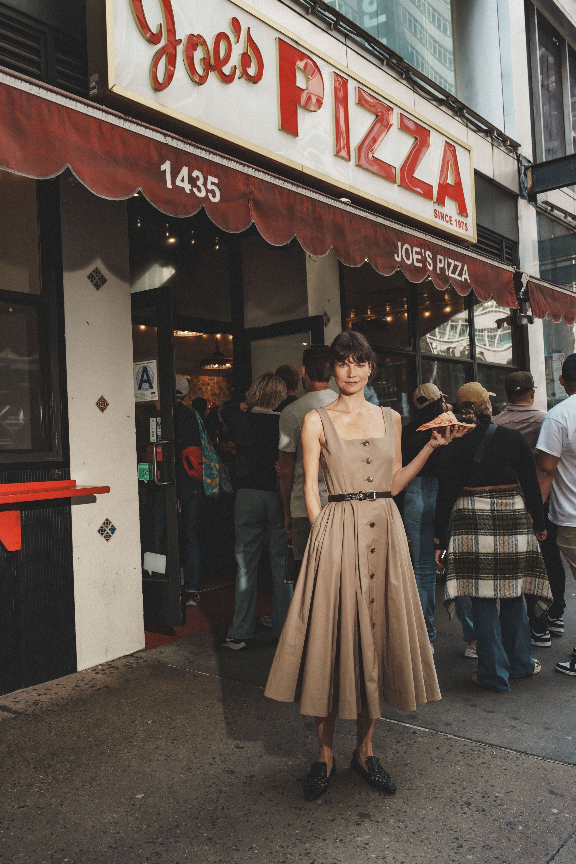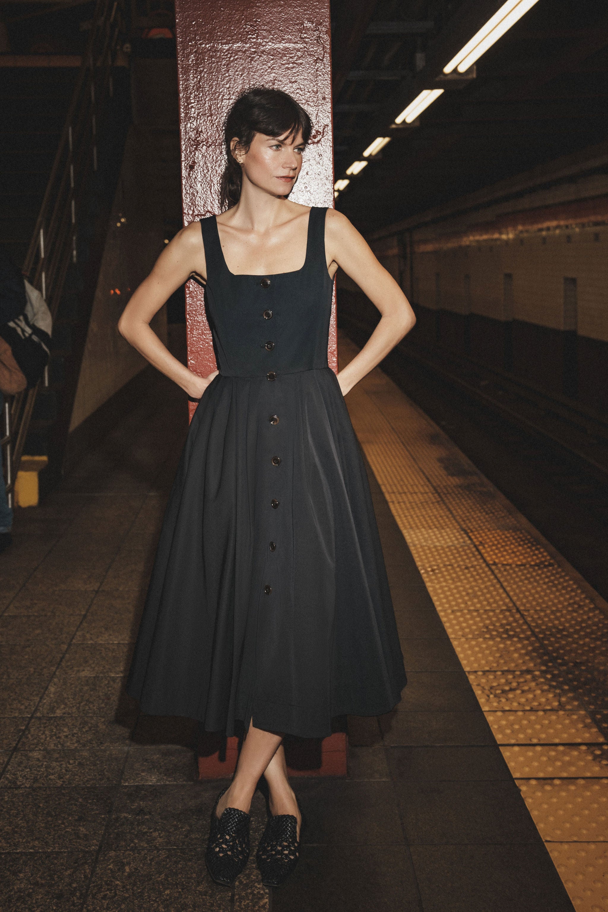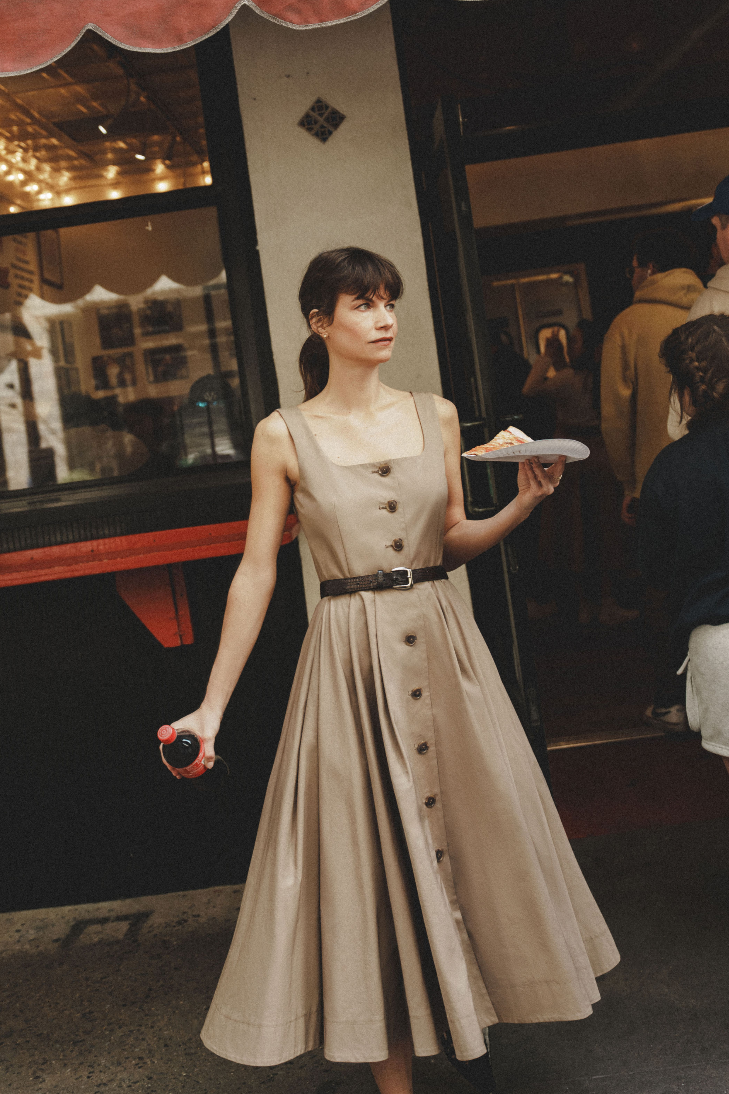 The Stathe Ocotillo Dress is made of a cotton blend and has a button-front closure and hidden pockets. The Ocotillo Dress is designed to emphasize the natural waist and hits above the ankle.