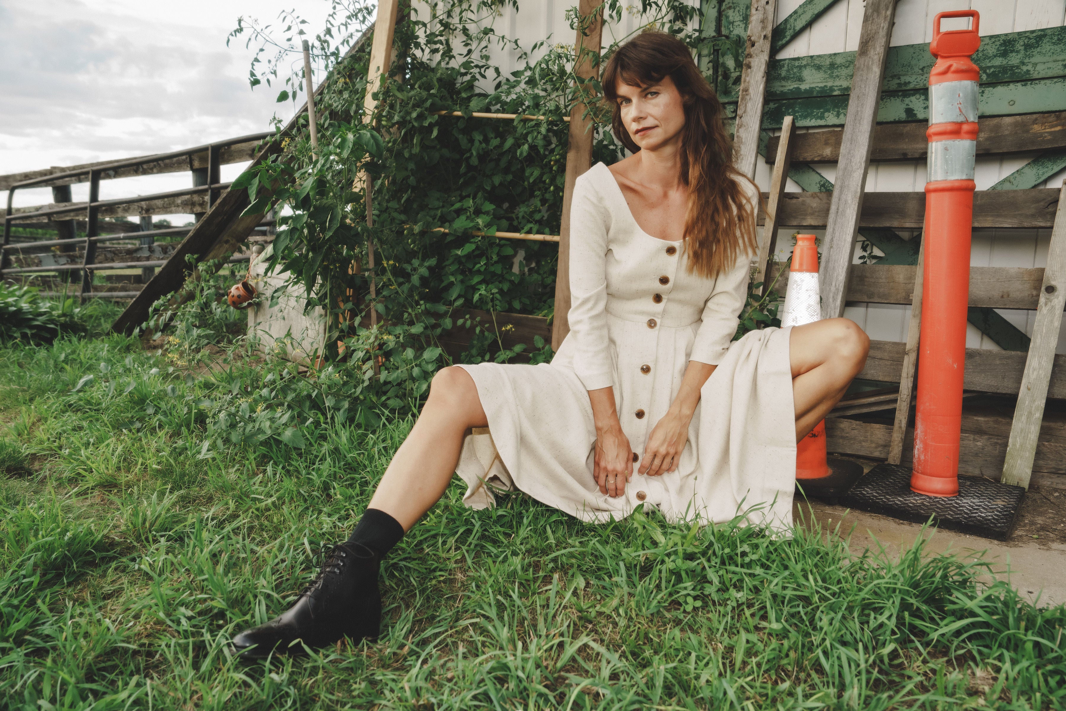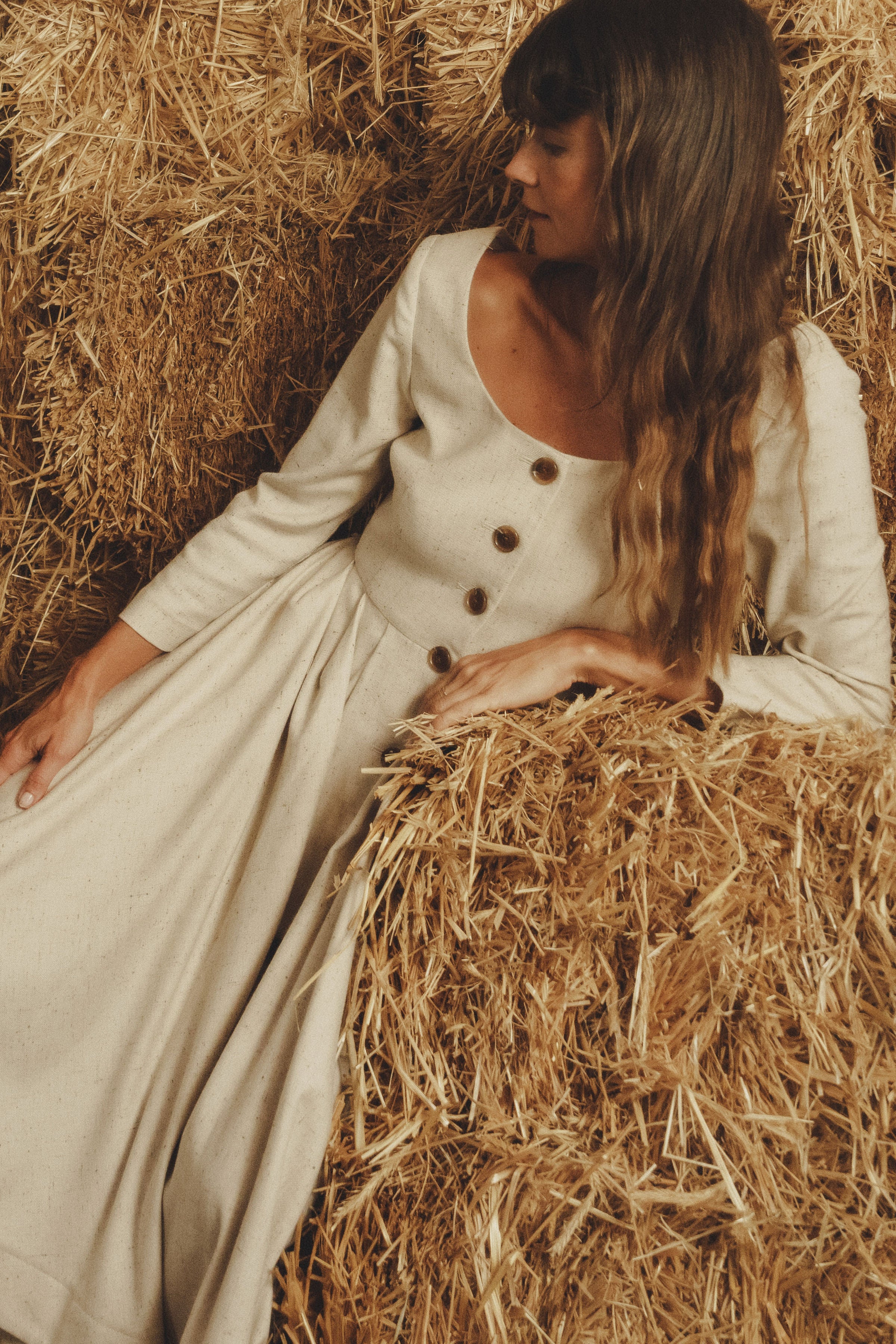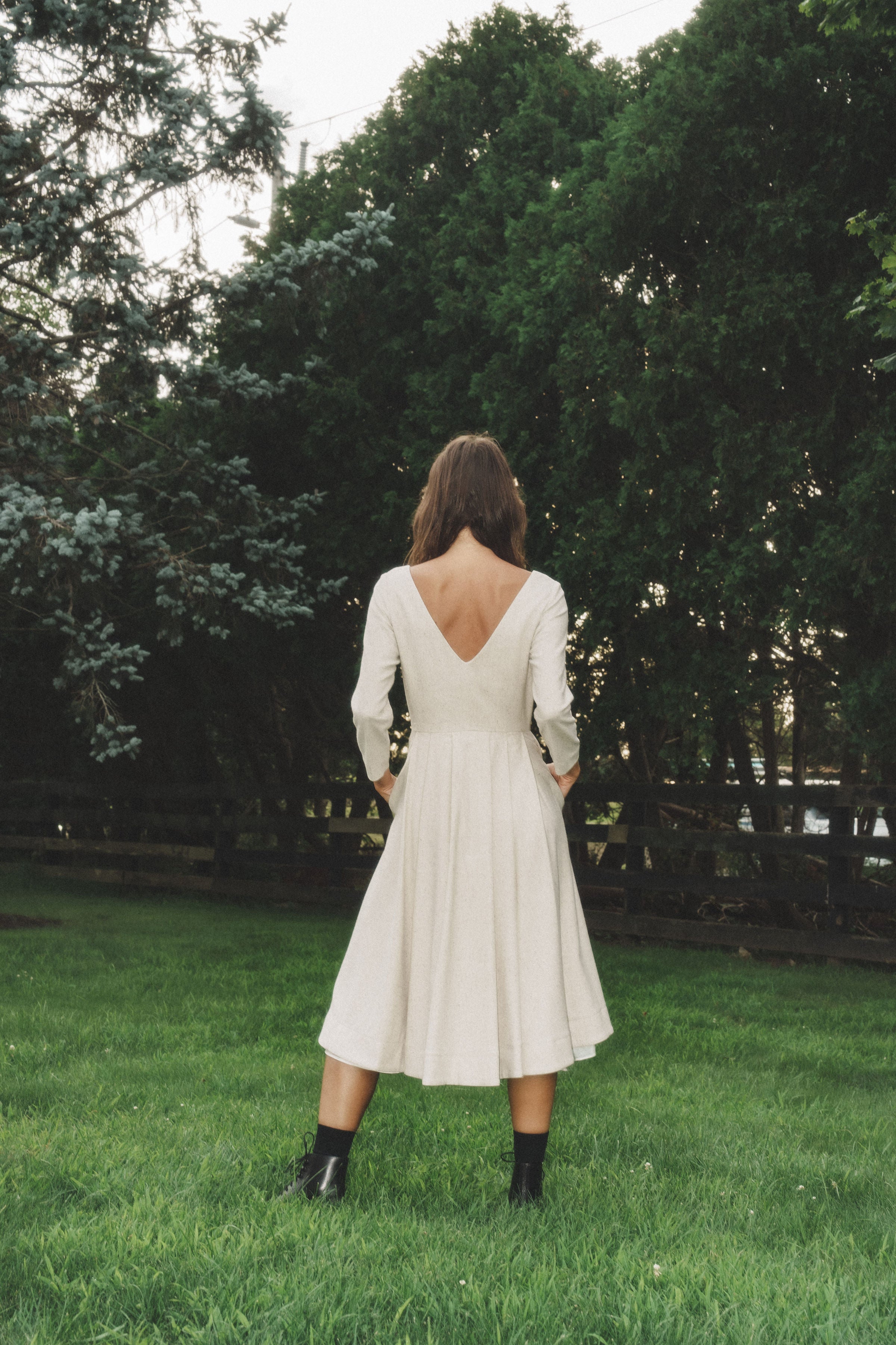 The Stathe Palosanto Dress is made of soft Italian lightweight wool blend in a speckled cream color. It is designed to accentuate the natural waist and hits above the ankle creating natural movement with the body. The Palosanto Dress features a button-front closure and three-quarter lenght sleeves. Silk lining.
