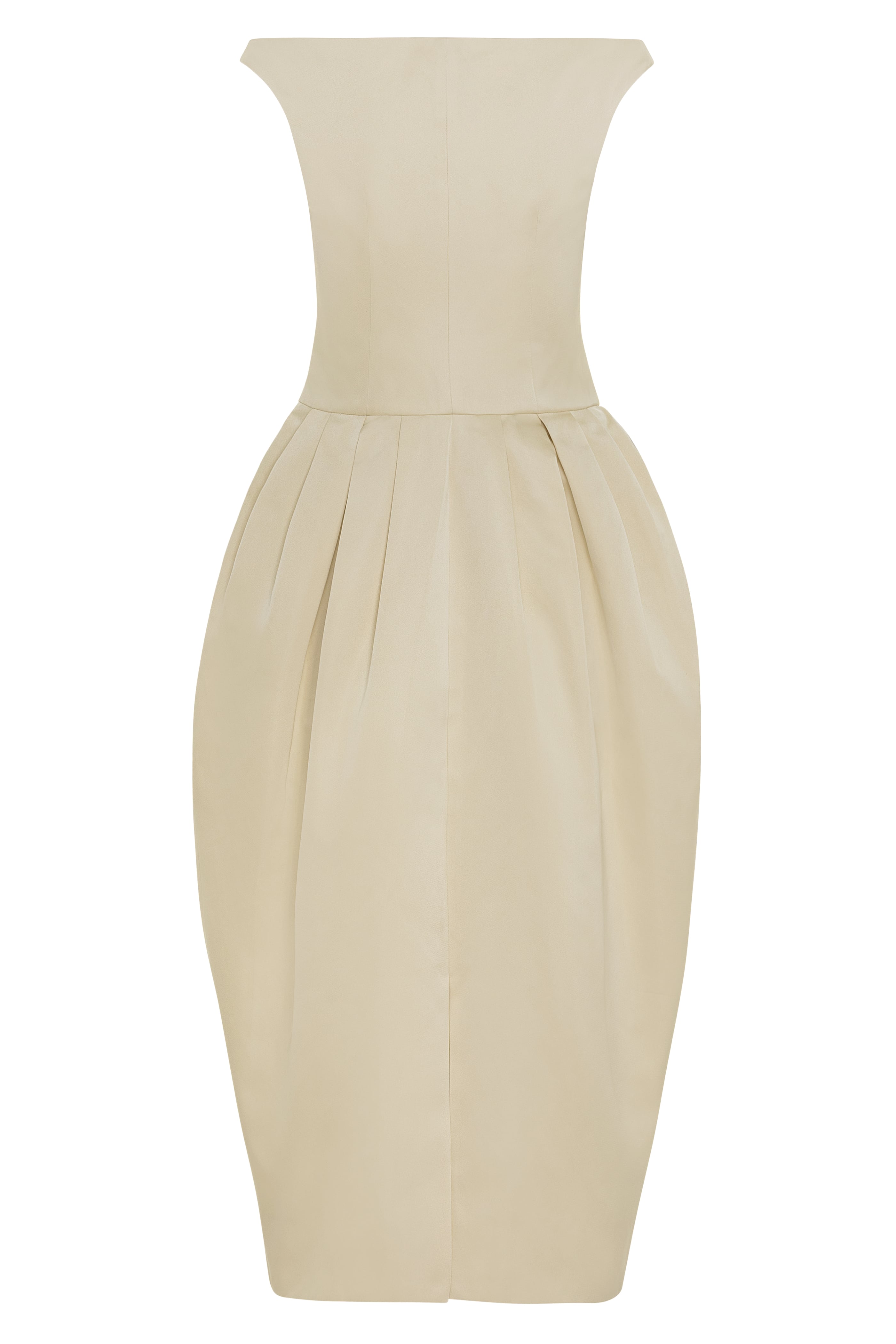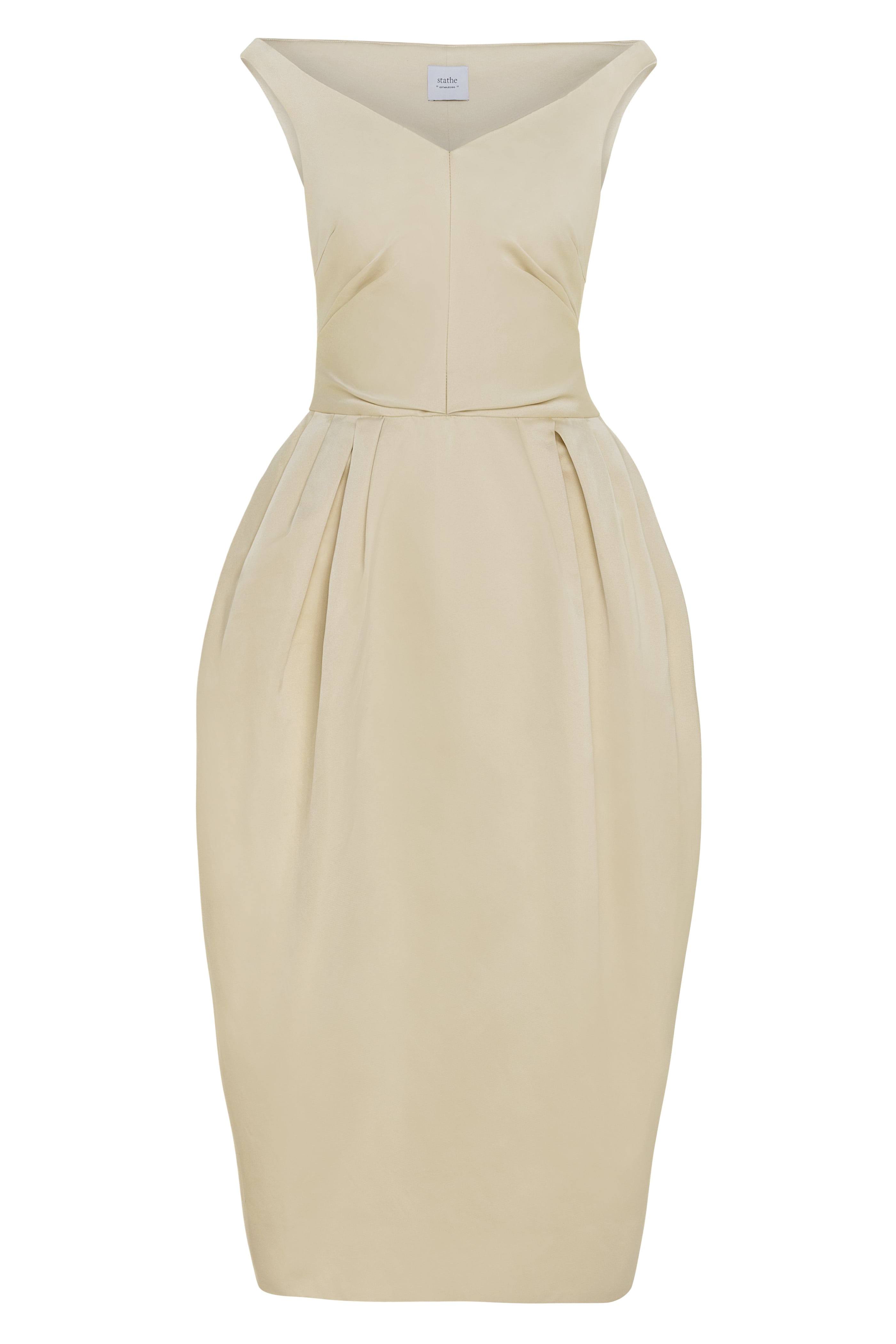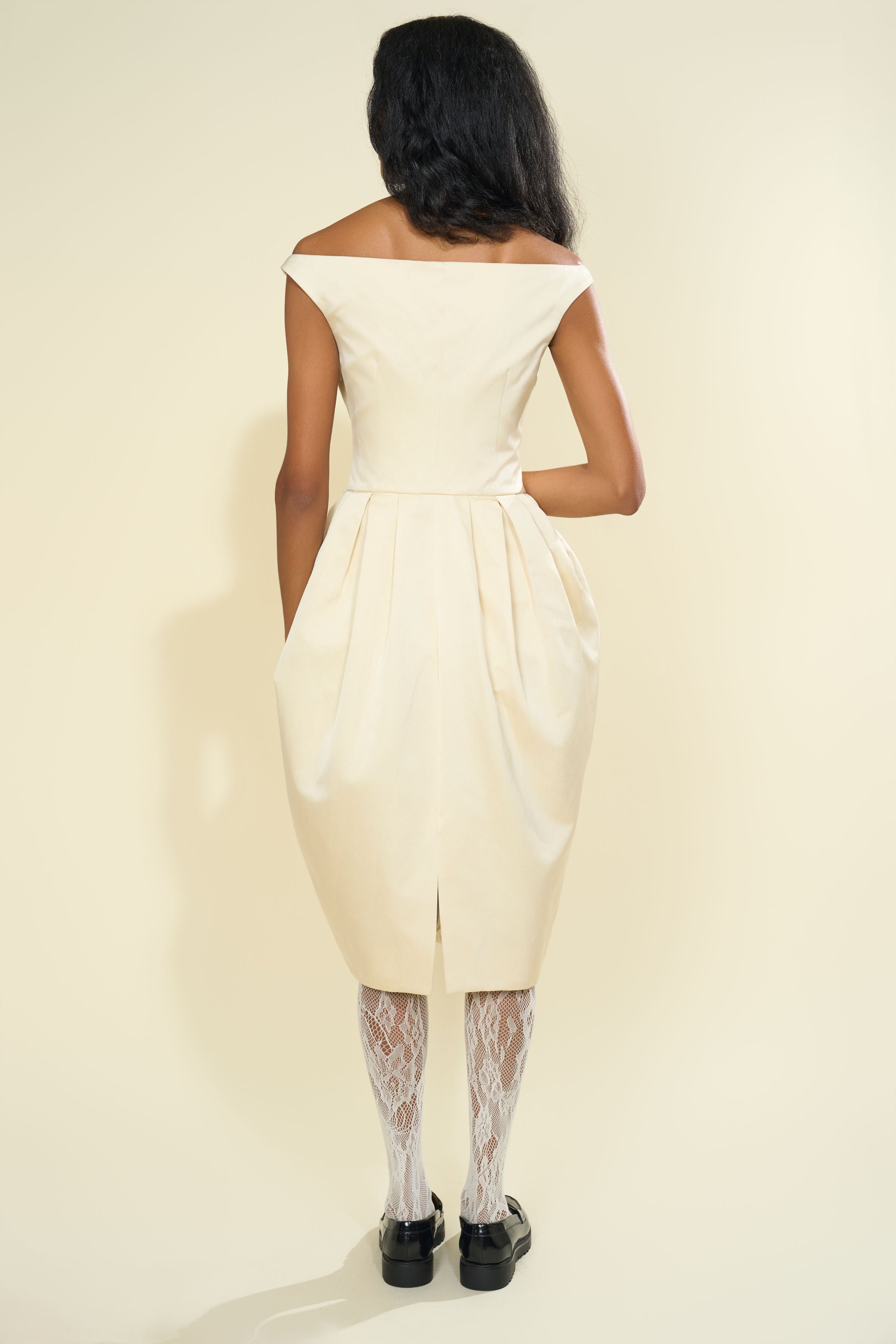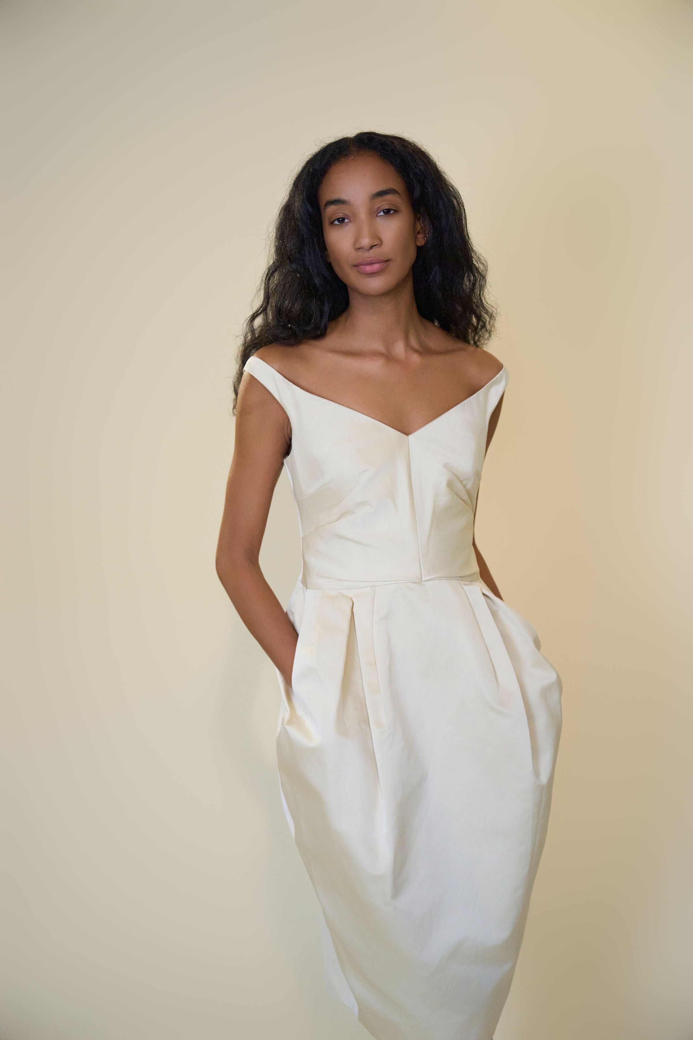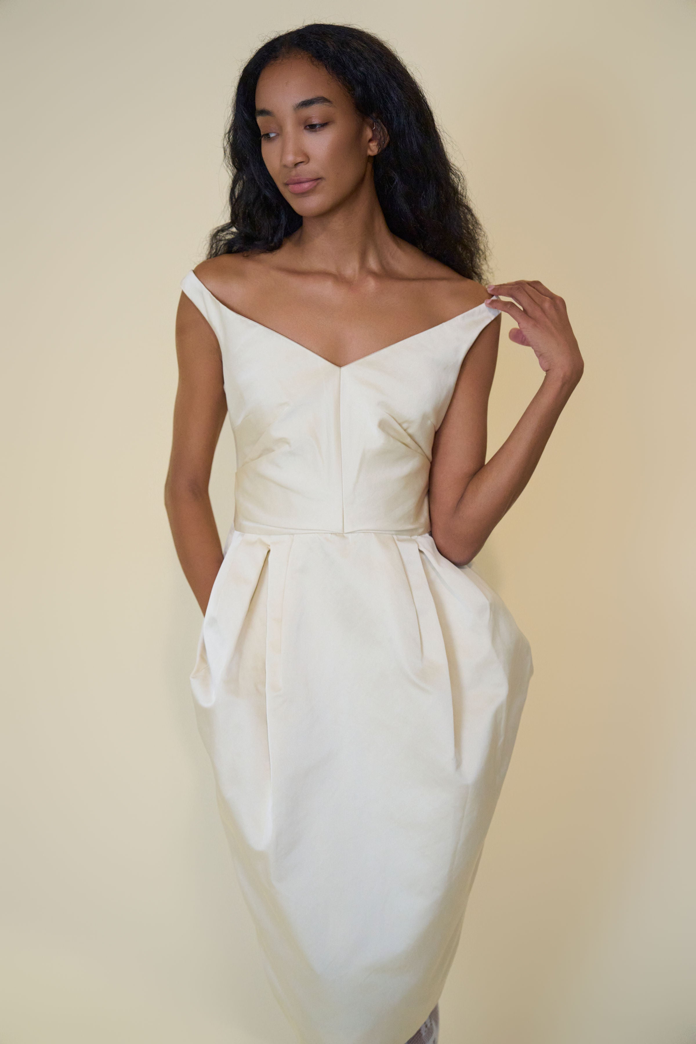 The Stathe Piloncillo Dress is made of buttery matte duchesse satin and is designed to sit off the shoulder. Pintucks along the waistline are used to emphasize the natural waist in a playful contrast with the pronounced volume of its skirt. The Piloncillo dress hits below the knee, has a back slit, hidden pockets, and a concealed side zip closure.