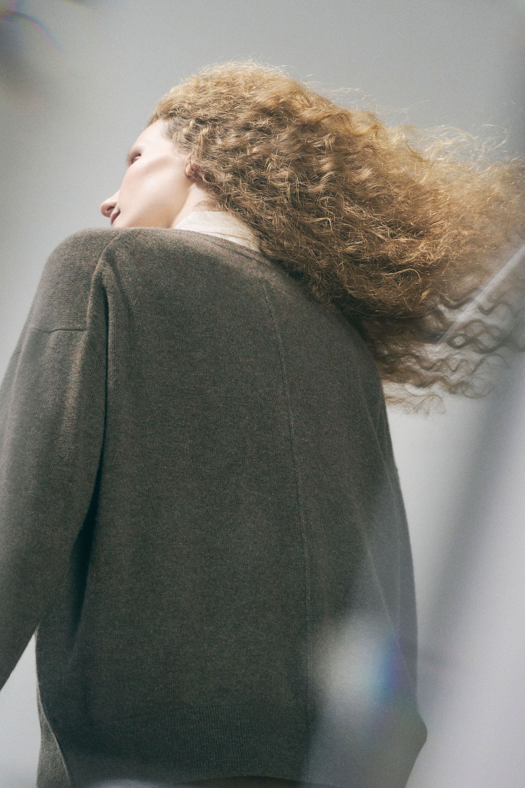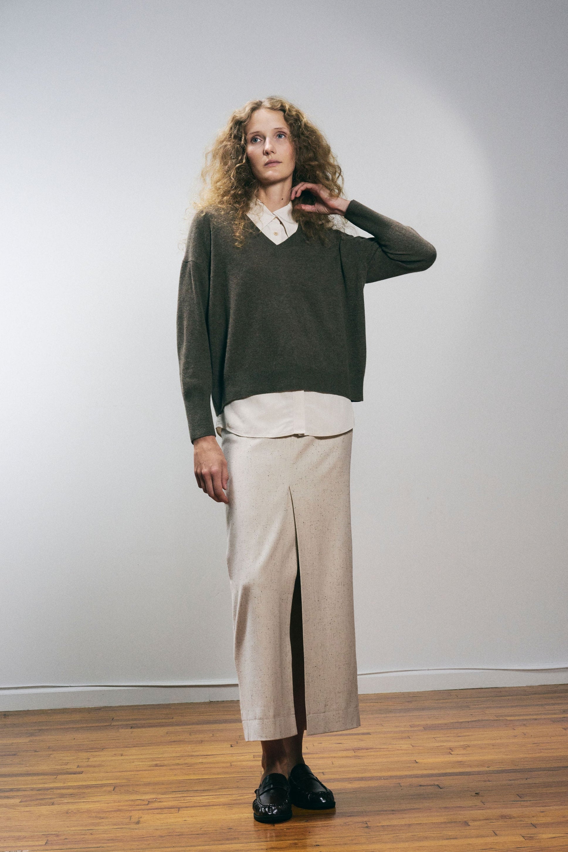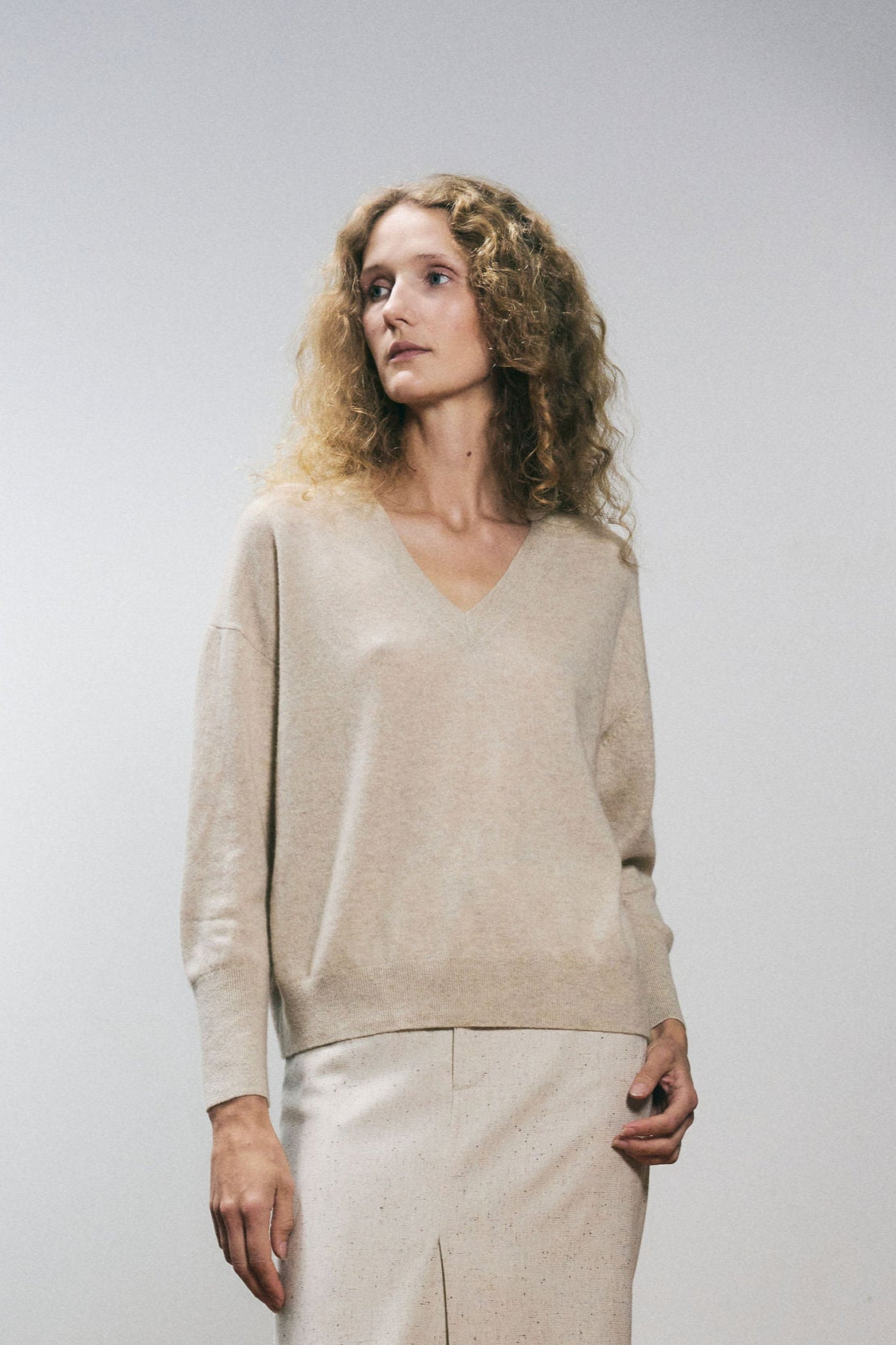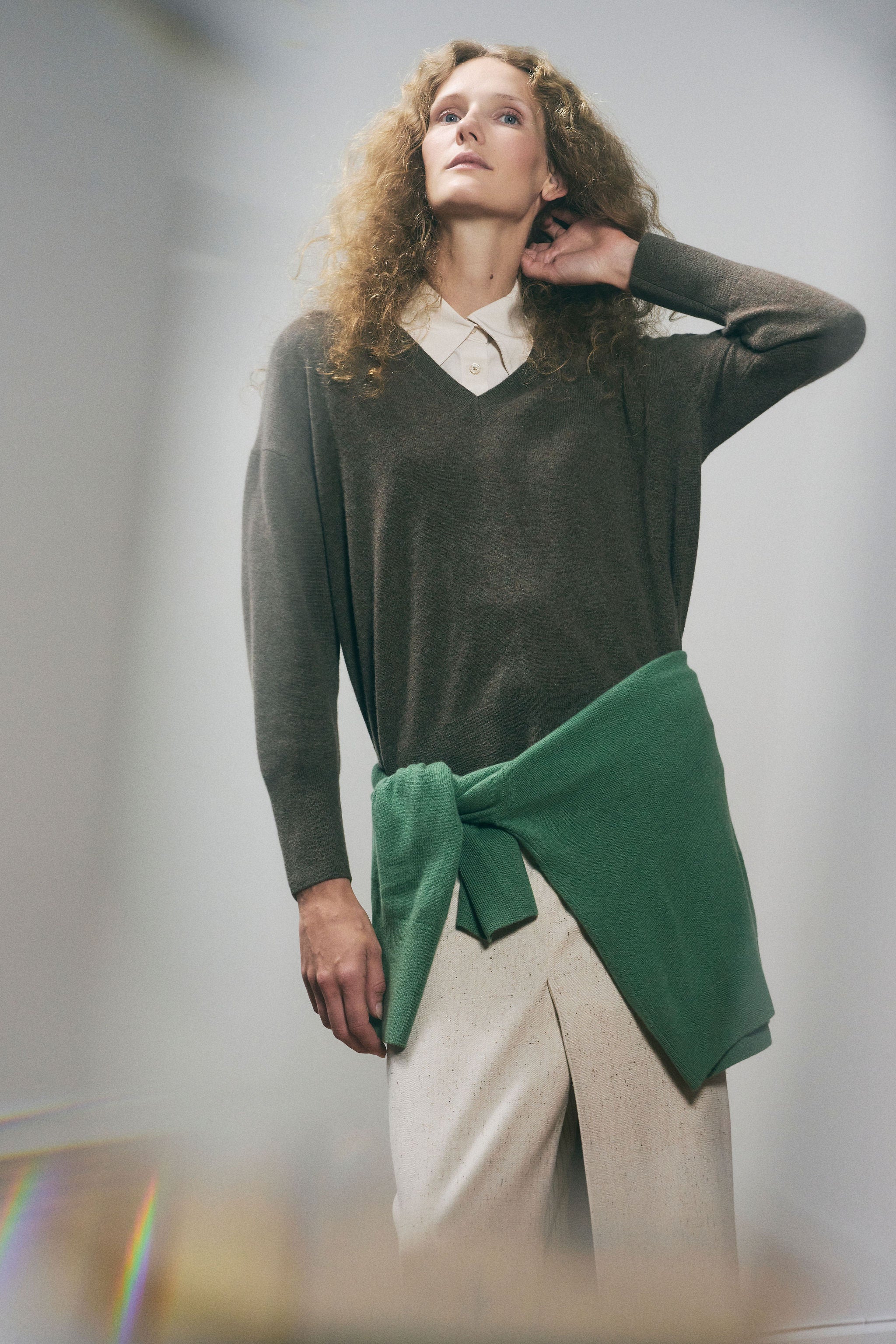 Knit only from noble sources of the finest Mongolian cashmere, the Salvia V-neck is extremely soft and buttery. A relaxed, boxy sweater with a beautiful fluid drape. It features a dropped shoulder, subtle ribbing at the cuffs and hem and a V neckline that sits below the collar-bone. A knit seam down the center back adds a special signature detail to our sweater. Meant for effortless layering or to stand on its own.