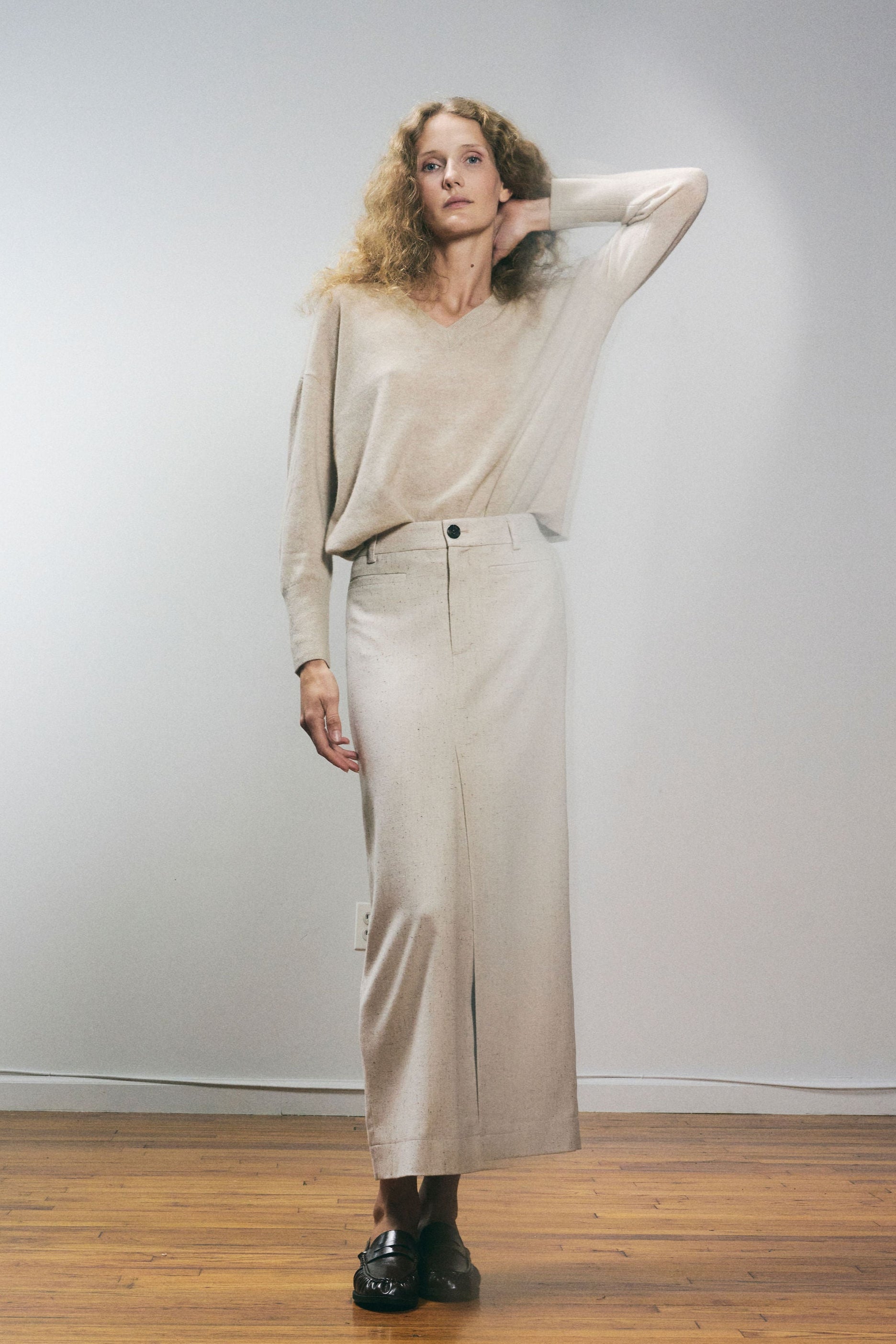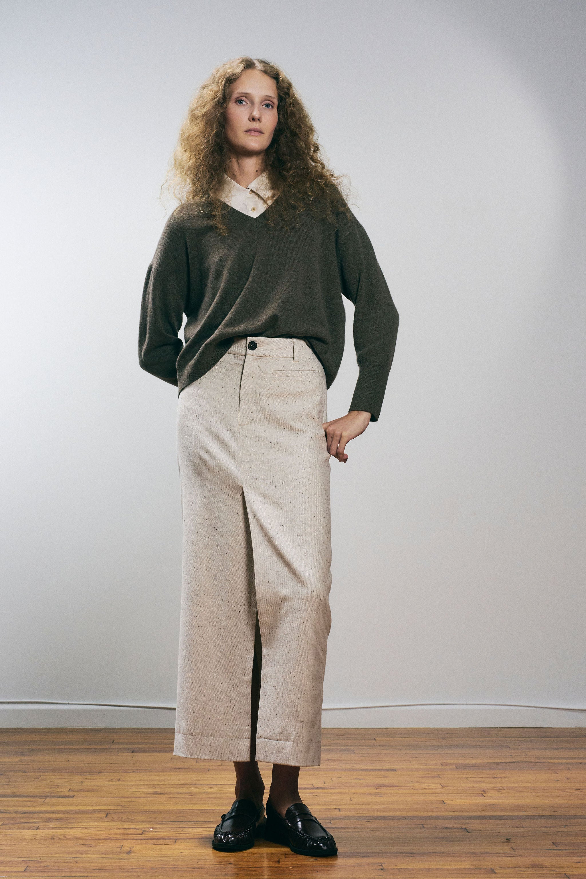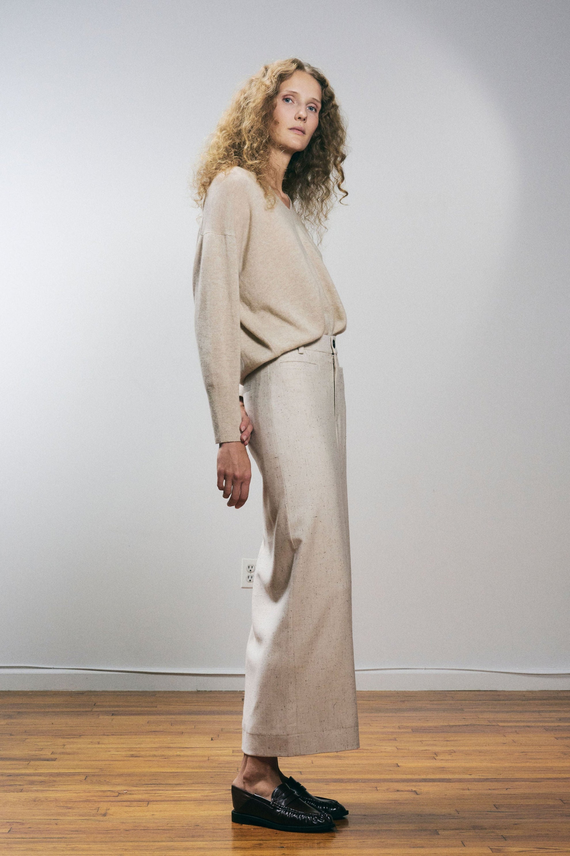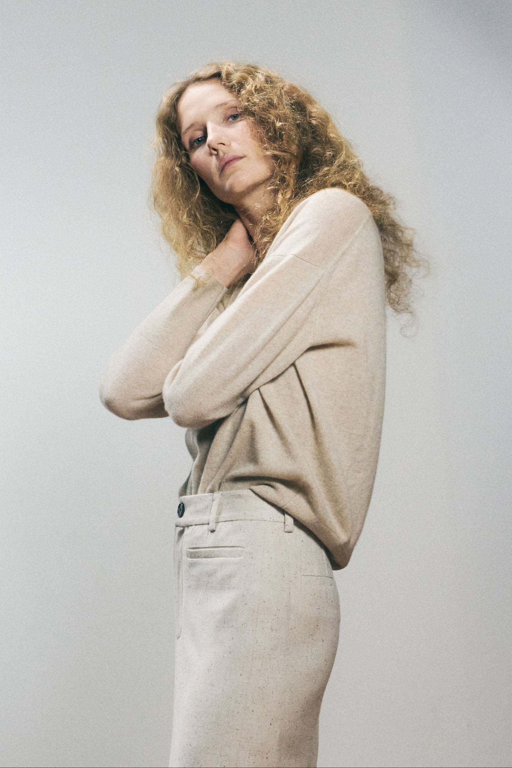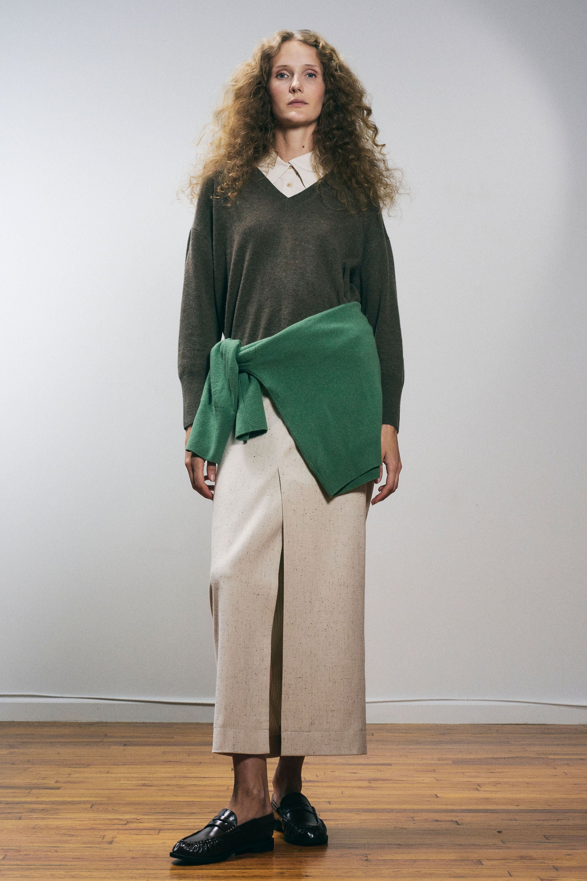 Knit only from noble sources of the finest Mongolian cashmere, the Salvia V-neck is extremely soft and buttery. A relaxed, boxy sweater with a beautiful fluid drape. It features a dropped shoulder, subtle ribbing at the cuffs and hem and a V neckline that sits below the collar-bone. A knit seam down the center back adds a special signature detail to our sweater. Meant for effortless layering or to stand on its own.