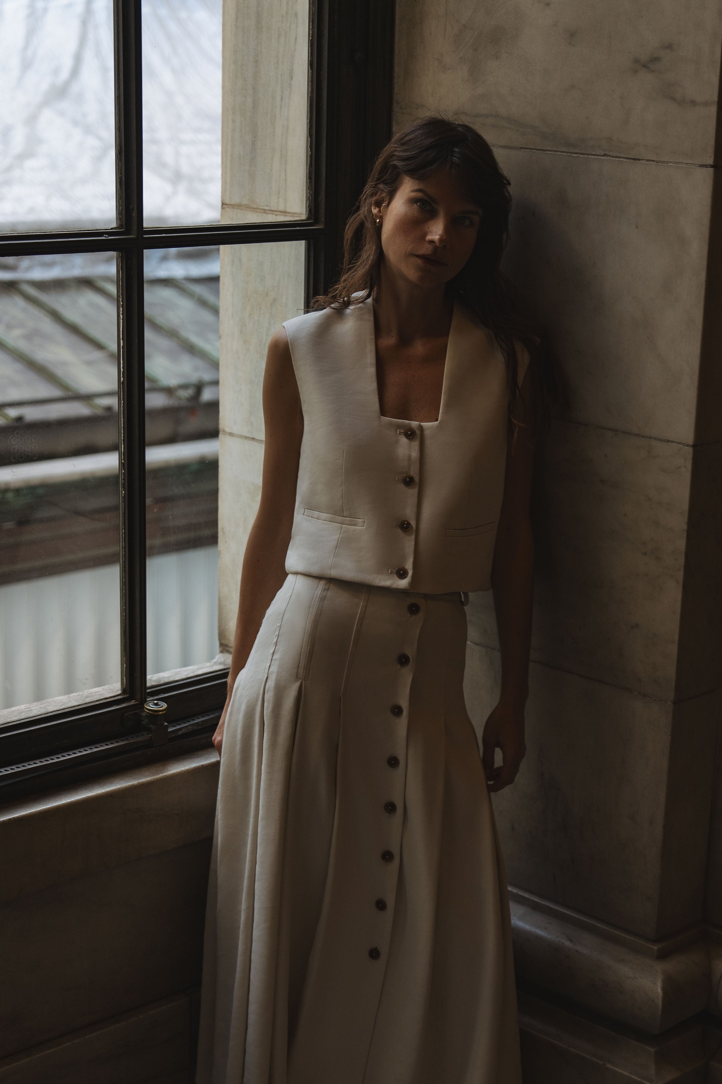 Crafted from supple Italian linen twill, the Ambrosia top is tailored in a structured, slightly boxy shape making it both elegant and easy. Its versatile length hits below the navel and features a deep squared neckline, horn style front buttons and decorative welt pockets. Lined in silk. Wear as a top or as a layering piece to elevate any look and style it with the coordinating Ambrosia skirt.